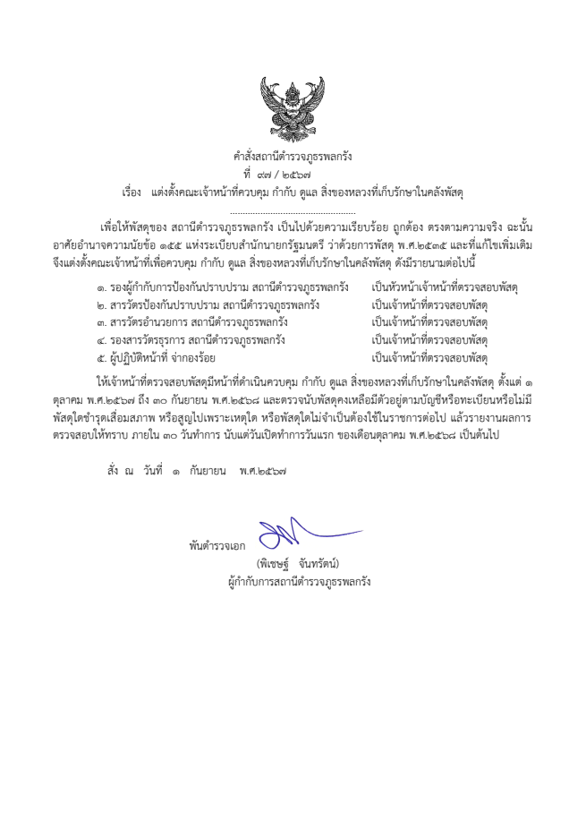 เมื่อวันที่ 16 ธันวาคม 2567 เวลา 13.00 น. พ.ต.อ.พิเชษฐ์ จันทรัตน์ ผกก.สภ.พลกรัง ประชุมข้าราชการตำรวจ สภ.พลกรัง ประจำเดือน ธันวาคม 2567  ณ ห้องประชุมชั้น 2 สภ.พลกรัง ได้มีการอบรมให้ความรู้เกี่ยวกับการจัดการทรัพย์สินของทางราชการ ของบริจาค และการจัดเก็บของกลาง เพื่อให้ข้าราชการตำรวจมีความเข้าใจถึงแนวทาง วิธีการจัดเก็บ การบำรุงรักษา การเบิก การคืน สิ่งของหลวง การดูแลรักษาสิ่งของบริจาค และการจัดเก็บของกลางในคดีอาญา จราจร การคืนของกลาง และกำชับให้ปฏิบัติตามระเบียบอย่างเคร่งครัด